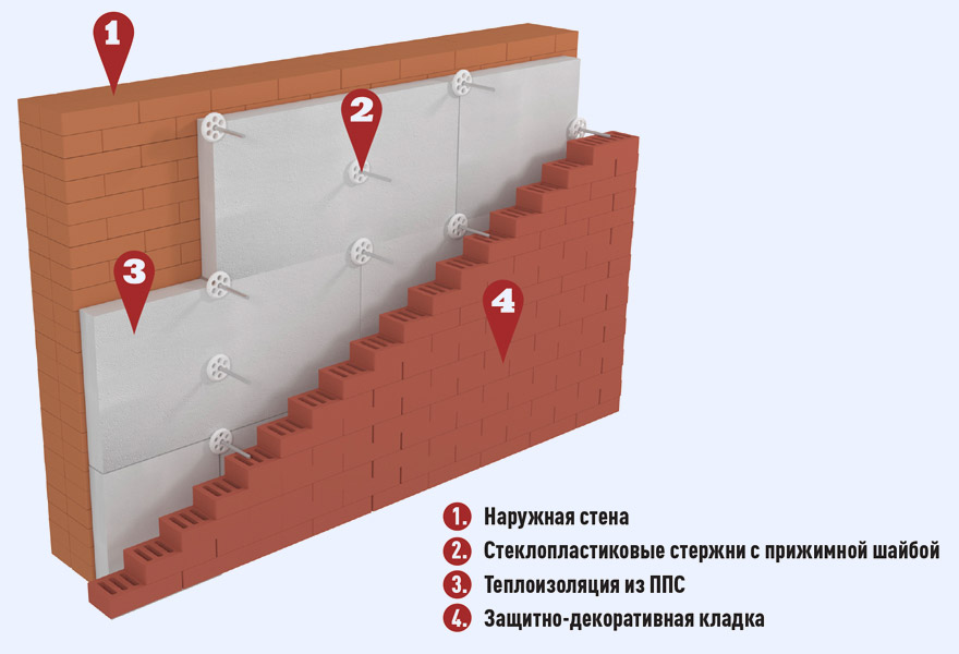 Разработан шаблон спецификации в соответствии с ГОСТ Р 21.1101-2013. Стена многослойная с облицовкой из кирпича толщиной 120 мм и теплоизоляцией из пенополистирольных плит ППС10-Р. Внутренний слой стены толщиной 250 мм выполнен из кирпича. Плиты теплоизоляции крепятся анкерами с тарельчатыми дюбелями. Применяется в многоэтажном строительстве.