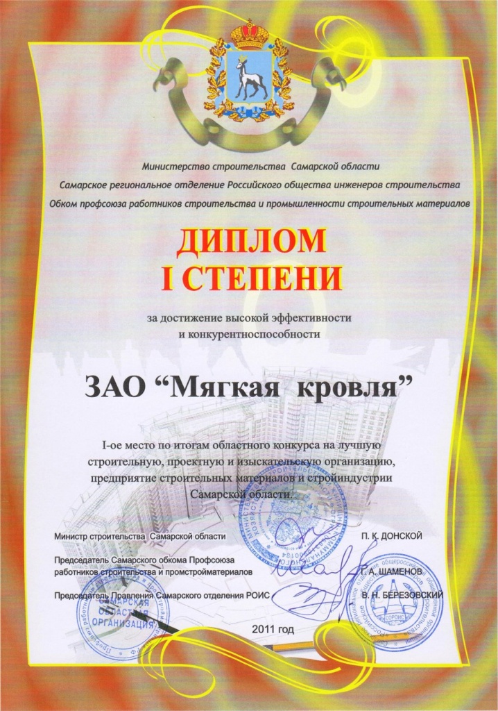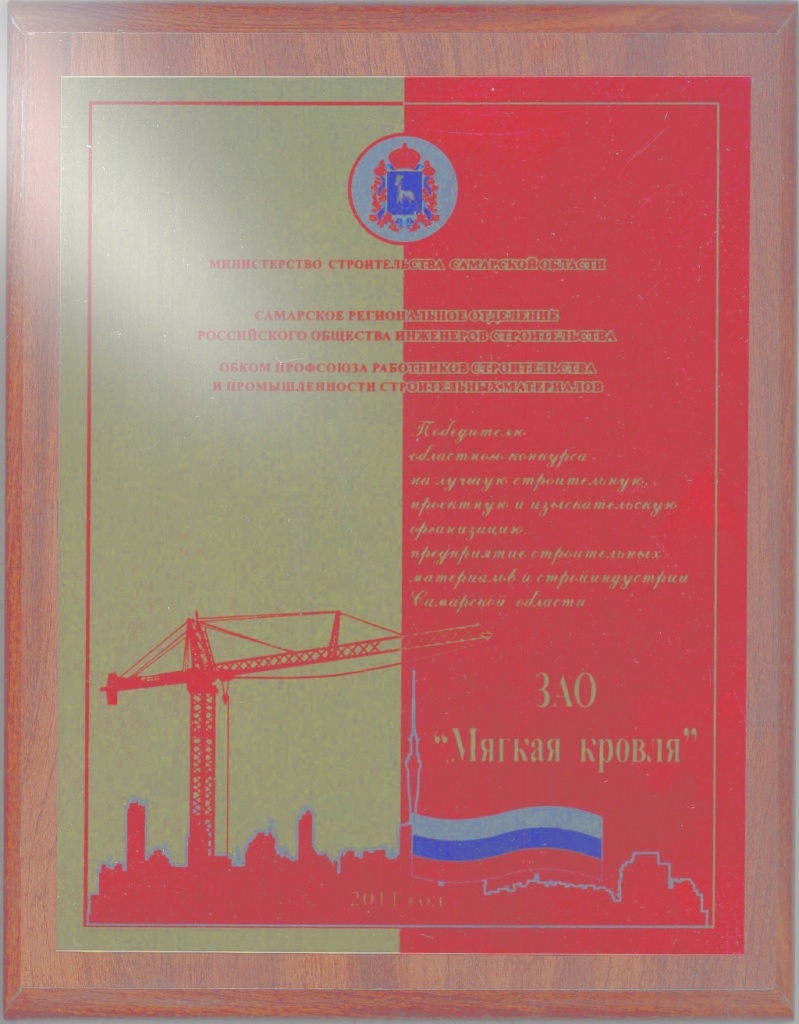В канун Дня Строителя подведены итоги ставшего традиционным регионального конкурса на лучшую строительную, проектную, изыскательскую организацию, предприятие строительных материалов и стройиндустрии Самарской области. Завод по производству мягкой кровли «Мягкая кровля» занял первое место.