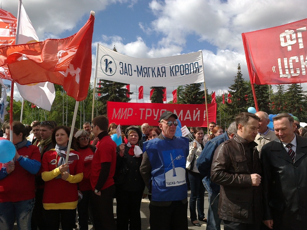 Завод «Мягкая кровля» принял участие на митинге посвященный Первому маю. Праздничное шествие трудящихся с транспарантами прошло от Дворца Спорта ЦСК до площади Куйбышева.