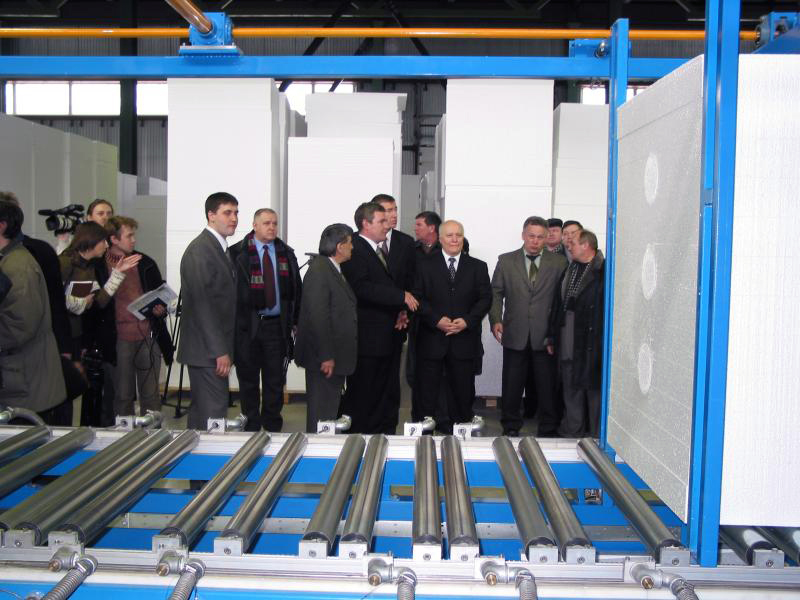 Далее, главе города Георгию Лиманскому и гостям презентации было продемонстрировано оборудование предприятия "ЕТ-пласт" в работе. На глазах посетителей были изготовлены пенополистирольные блоки, а затем эти блоки были разрезаны на плиты.